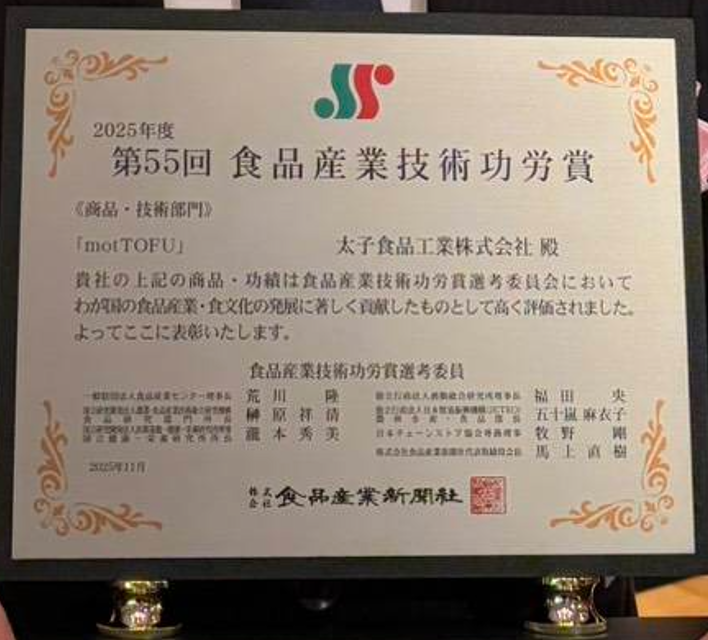 この度、当社で製造販売しております、なめらか豆腐バー・豆腐スイーツバー「モットーフ」が、食品産業新聞社主催による「第55回(令和7年度)食品産業技術功労賞(商品・技術部門)」を受賞いたしました。