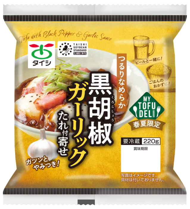 黒胡椒ガーリックたれがついた、つるりなめらかな食感の寄せ豆腐です。